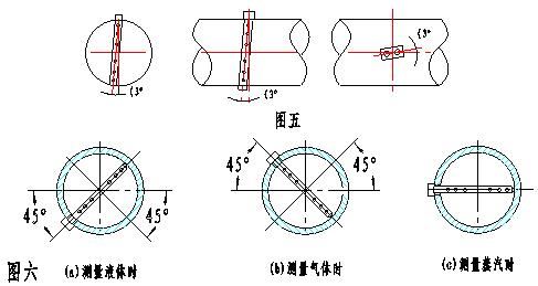 3、 對于垂直管道,檢測桿可安裝在管道水平面沿管道圓周360°的任何位置上,高低壓引壓管接頭應(yīng)處于同一水平面上。對于水平管道,在測量液體時檢測桿插入位置應(yīng)位于管道橫截面水平面中心線45°以下的范圍內(nèi);測量氣體時檢測桿插入位置應(yīng)位于管道橫截面水平面中心線45°以上的范圍內(nèi);測量蒸汽時檢測桿應(yīng)水平插入,見圖六: