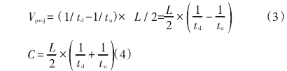 如圖1所示,一對(duì)換能器A和B以聲道長(zhǎng)度L、聲道角φ安裝在流道2側(cè),流體中超聲傳播速度C會(huì)與聲道投影流速Vproj→Vcosφ疊加,造成超聲從下游到上游換能器的傳播時(shí)間tu小于從上游到下游換能器的傳播時(shí)間td那么,其計(jì)算如式1~4所示。