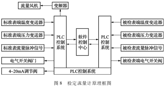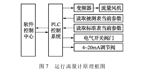 運(yùn)行系統(tǒng)基本原理如圖7所示。根據(jù)流量計(jì)運(yùn)行方案由軟件控制中心通過PLC控制系統(tǒng)指令來控制閥門的打開和關(guān)閉狀態(tài)。然后軟件控制中心通過PLC控制系統(tǒng)控制電氣開關(guān)閥、4~20mA調(diào)節(jié)閥的開度、變頻器的頻率控制流量風(fēng)機(jī)轉(zhuǎn)速等方式控制流量大小,軟件控制中心實(shí)時(shí)讀取標(biāo)準(zhǔn)表流量脈沖信號(hào)并結(jié)合標(biāo)準(zhǔn)表儀表系數(shù)計(jì)算出工況流量,當(dāng)工況流量值等于目標(biāo)流量值時(shí),穩(wěn)定變頻器的頻率和閥門狀態(tài),讓各個(gè)流量計(jì)處于運(yùn)行狀態(tài)中。