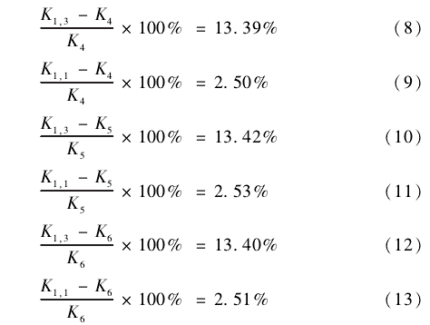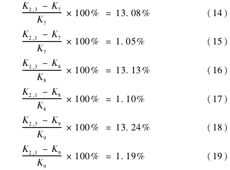 對2#電磁流量計在聚合物溶液中得到的儀器常數(shù),與電磁流量計在自來水中得到的儀器常數(shù)進行對比分析。首先計算分析2#電磁流量計在3種不同黏度/濃度的聚合物溶液中得到的儀器常數(shù)K7、K8、K9,3個儀器常數(shù)相互之間差別很小,因此判斷2#電磁流量計響應(yīng)規(guī)律受聚合物溶液濃度和黏度的影響很小,可以忽略不計。然后分別對2#電磁流量計在3種不同黏度/濃度的聚合物溶液中得到的儀器常數(shù)K7、K8、K9與2#電磁流量計在自來水中得到的包括層流和紊流兩種流態(tài)的儀器常數(shù)K2.3進行對比計算、與2#電磁流量計在自來水中得到的層流流態(tài)的儀器常數(shù)K2.1進行對比計算,得