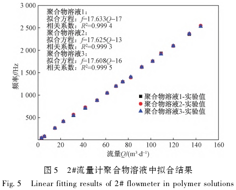 圖4為1#電磁流量計在0~200m³/d流量范圍,濃度分別為1000、1500、2000mg/L聚合物溶.液中的測量數(shù)據(jù)及線性擬合結(jié)果,將1#電磁流量計在3種聚合物溶液中得到的儀器常數(shù)(線性擬合曲線的斜率)分別記為K4=17.224、K5=17.219、K6=17.222。